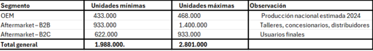 Teniendo en cuenta que el parque automotor argentino alcanzó en 2024 un total de 15.552.418 vehículos en circulación (AFAC, 2024), y considerando que la vida útil promedio del tensor de correa es de entre 60.000 y 100.000 kilómetros, es razonable estimar que entre el 10 % y 15 % del total del parque requiere el reemplazo de este componente cada año. Esto nos permite proyectar una demanda anual en el mercado de reposición (aftermarket) que oscila entre 1.555.000 y 2.333.000 unidades. | |||
