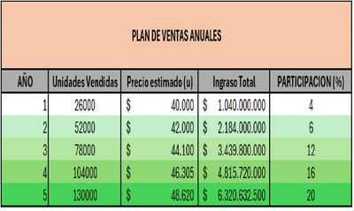 En base a los análisis realizados sobre el mercado consumidor y la competencia, se proyecta una penetración inicial del 4% del mercado total en el primer año. El precio de venta estimado por unidad es de $40000, con ajustes anuales aproximados del 5% por inflación. El volumen de ventas crecerá de forma gradual a medida que se consolide la marca, mejore la distribución y se generen relaciones comerciales sostenidas con distribuidores del rubro.