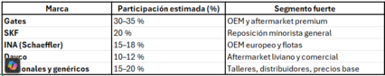Esta cuantificación permite identificar con claridad que el mercado argentino de tensores ofrece una escala significativa y sostenida en el tiempo, donde el segmento de reposición (aftermarket) representa una gran oportunidad para empresas que puedan ofrecer productos con disponibilidad inmediata, precios competitivos y respaldo técnico. | |||