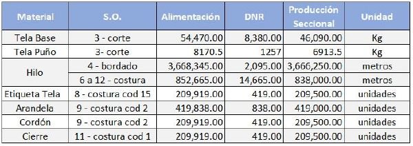 * para las etiquetas de tela, arandelas, cordones y cierres, consideramos un desperdicio de una unidad cada quinientas | |||
