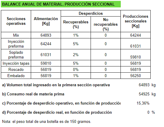 El chiller de la sopladora consumirá aproximadamente 30lpm de agua, totalizando una necesida de 158m3 de agua por mes. Por otro lado en base a consumos promedio y nuestra base de empleados consideramos para el baño una necesidad de 6.000 litros por mes de agua y 1.000 litros por mes para cocina. Totalizando un uso de 165m3 de agua por mes.