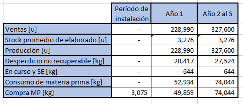 - Las cantidades de materia prima del año 1 corresponde a los datos de puesta en marcha: