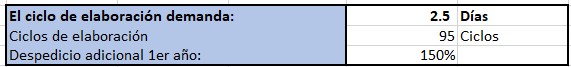 El ciclo de elaboración para cumplir con un lote de | El ciclo de elaboración para cumplir con un lote de 967 unidades de flexibles es de 2,5 días. Es decir que en un año se realizan 95 ciclos de elaboración. | ||