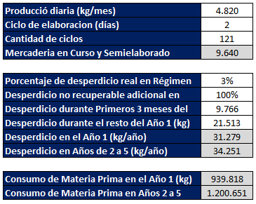 Se tomó como el volumen total ingresado de materias primas para la producción en régimen de 1.166.400 kg de gomitas (teniendo en cuenta los desperdicios no recuperables), a la sumatoria entre: los insumos necesarios para la premezcla, aditivos y cera de abeja.