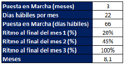 Para la puesta en marcha se estimaron 90 días hábiles, con lo cual como el mes tiene 22 días hábiles, concluimos en que tendremos una puesta en marcha de aproximadamente 4,1 meses.