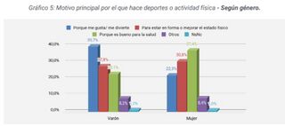En los siguientes gráficos podemos observar información estadística de las motivaciones, las actividades predominantes y los lugares más frecuentados de esta porción de la sociedad a la que apuntamos. Estos porcentajes varían según el sexo, por ejemplo, la motivación principal de los hombres es la diversion y para las mujeres es la salud. Con respecto al tipo de actividad, los dos hacen caminatas o corren y andan en bicicleta casi en la misma proporcionalidad, pero los hombres juegan más al fútbol y las mujeres realizan más actividades como yoga. Por último, el lugar donde realizan deporte no varía en gran medida entre los dos sexos y se mantiene equitativo, pero se puede observar que mayor porcentaje de mujeres realizan actividad física en sus casas.