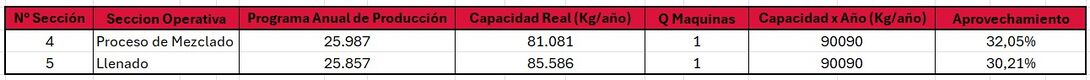 En el proceso productivo se cuenta con dos maquinarias automáticas: la mezcladora y la envasadora, cuyos rendimientos son del 90% y 95% respectivamente. Como se menciona en el apartado de procesos productivos, la capacidad de ambos sectores es de 750 unidades por hora, lo que equivale a 48,75 Kg por hora.