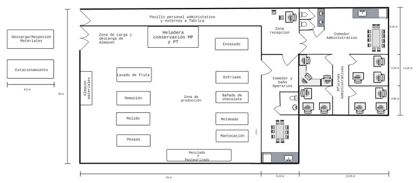 Plano de la Planta mostrando la distribución de las distintas áreas (Producción, Administración y Comercialización)