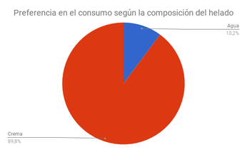 [[Archivo:Chart_(4).png|right|346x346px]]Continuamos con el estilo de helado, diferenciandonos en helado de crema o de agua, siendo elegido en su mayoría el primero con un 89,8% es decir 955 personas lo eligen. | |||
