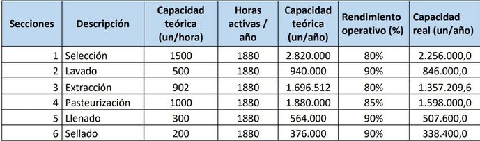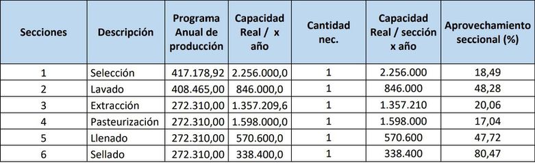 Por lo tanto el cuello de botella sera la sección 6 con un aprovechamiento seccional del 80.47%, como consecuencia de esto, la capacidad real del equipo sera de 388.400 litros.