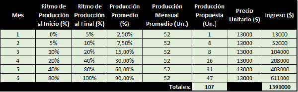 Por otro lado, estimamos que el período de puesta en marcha durante el primer año será de 6 meses, siendo los niveles de producción y ventas al finalizar cada mes 5, 10, 20, 40, 80 y 100% de la programación normal de 52 incubadoras, respectivamente.