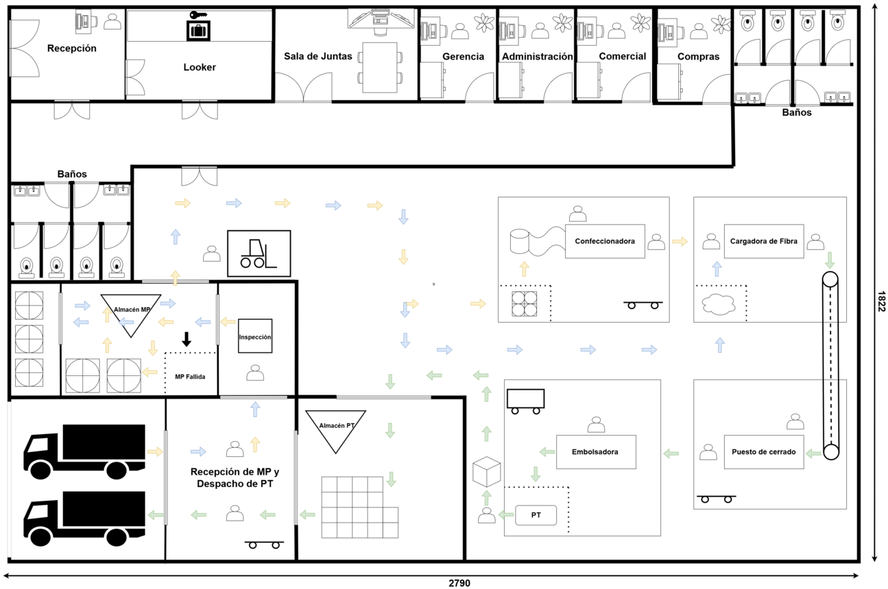 Plano de la Planta mostrando la distribución de las distintas áreas (Producción, Administración y Comercialización).