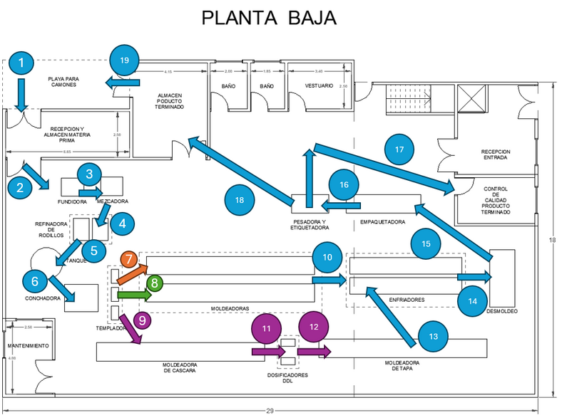 - Ubicada desde el fondo hacia el frente del edificio para optimizar el flujo productivo de acuerdo a los almacenes de MP y PT.