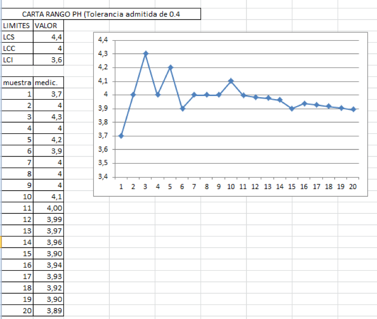 Las planillas que nos permitirán observar el control de las mediciones serán las Cartas de Media donde podremos observar si el valor se encuentra dentro de los límites admisibles, como por ejemplo la que adjuntamos a continuación para la medición de PH. Propondremos una tolerancia de +- 0,4 a lo alrgo de 20 muestras consecutivas.