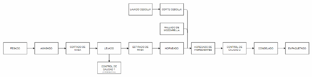 - Operación 65: Empaquetado. Se colocan las pizzas en la empaquetadora para sellarlas con un film de polipropileno y protegerlas. Luego, manualmente, se colocan las pizzas en la caja correspondiente y se transportan a una cámara frigorífica para ser almacenadas.
