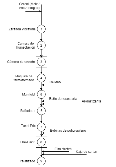 Los equipos involucrados son: zaranda vibratoria, cámara de humectación, cámara de secado. El cereal es dosificado en la zaranda vibratoria que filtra los objetos extraños que pudieran estar en el arroz. La vibración de la zaranda impulsa al cereal a la cámara de hidratación, encargada de rociarlo con agua. El cereal que sale del humectador se transfiere a una segunda cinta que lo transporta a la cámara de secado, donde el producto recibe aire caliente reduciendo la humedad superficial del mismo. Finalizado esta etapa el grano es almacenado en bandejas donde debe reposar como mínimo 40 min antes de utilizarlo en el equipo formador de galletas.
