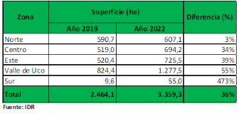 Si bien no hubo variaciones en 2022 respecto a 2021, sí las hubo entre 2019 y 2021. En promedio se aumentó en un 36% la superficie cosechable.