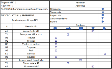 | Operación | Triturado | Mezclado | Formado | Empanado | Cocción | Congelado | Envasado |