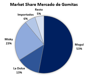 Las pastillas de goma se denominan comúnmente “gomitas”, y están estrechamente asociadas a la marca Mogul, que pertenece al Grupo Arcor, líder en el mercado de las golosinas en Argentina. En segundo lugar, existen competidores de menor tamaño que también tienen una significativa participación en el mercado, entre ellos se encuentran marcas como Yummy y Billiken de La Dolce, e importadas como Sourpatch o Haribo.