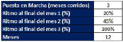 La planta trabajará durante los 12 meses del año, 22 días hábiles por mes y como se estipuló una Puesta en Marcha de 3 meses corridos, la misma corresponderá a 66 días hábiles.