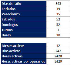 Los operarios trabajarán en turnos de 10 horas de lunes a viernes. Además, las vacaciones serán tomadas por los operarios de forma rotativa por lo cual no causarán una parada de la planta. Es decir, que estos días no influirán en los días activos anuales. Por todo lo anterior definimos que la planta trabajará 12 meses de 22 días al año.