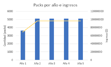 Gráfico de packs e ingresos por año.