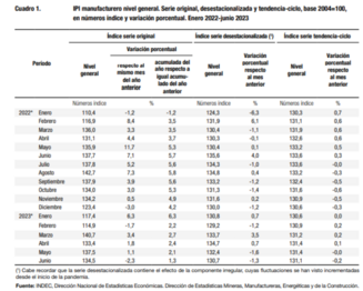 En junio de 2023, el Índice de producción industrial manufacturero (IPI manufacturero) muestra una caída de 2,3% respecto a igual mes de 2022. El acumulado enero-junio de 2023 presenta un incremento de 1,3% respecto a igual período de 2022.
