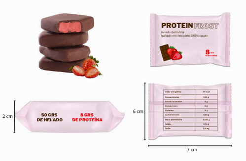 Teniendo en cuenta lo previamente mencionado, Protein Frost propone que el producto venga presentado en un envase del tipo “Flow Pack”, el cual se muestra en inciso previo: "planos del producto"