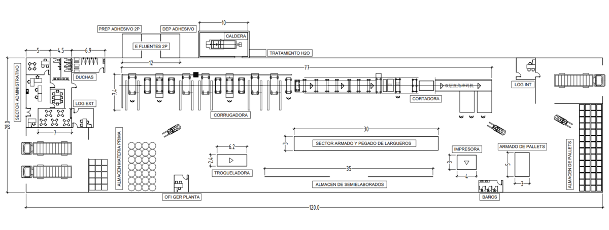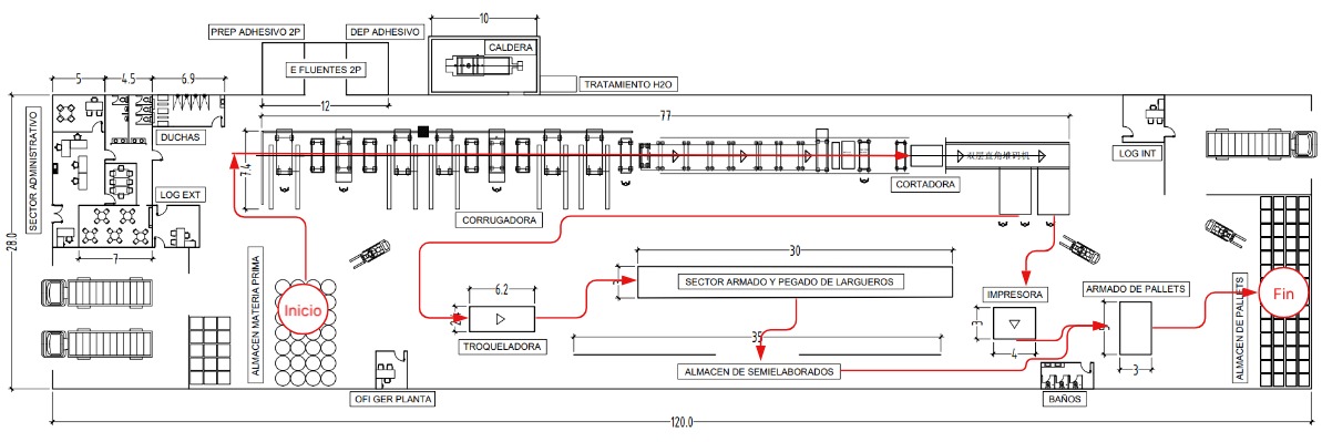 Dado que la confección de la cubierta superior y de los largueros se fabricará a partir de cartón corrugado de 1200 mm de ancho, en el proceso de corte (al final de la máquina corrugadora) se generará un scrap durante la producción de los largueros transversales de 200 mm por larguero.