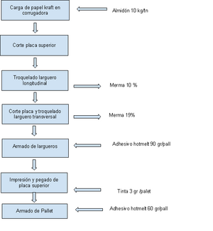 Para la producción de los pallets de cartón corrugado se necesitan cuatro insumos principales: papel kraft y adhesivo a base de almidón de maíz para la confección del cartón corrugado; adhesivo hot melt para adherir los pliegues de los largueros y fijar éstos a la cubierta superior; y tinta para la impresión de la cubierta.