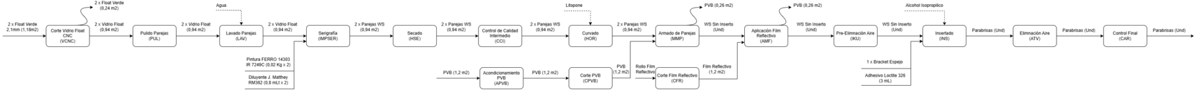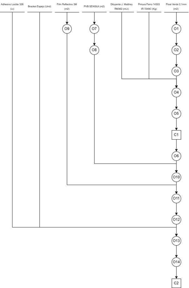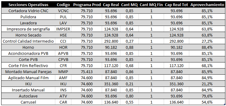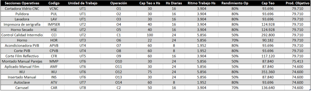 Operación 1: Consiste en el corte de las láminas de Vidrio Float a través de una máquina CNC. La misma realiza la operación de forma automática a partir de una punta metálica que marca el vidrio, al terminar el contorneado se produce un pequeña sacudida que desprende el vidrio con la posterior segregación del excedente. Se requiere exclusivamente de un único operario que haga las actividades de preparación de la máquina, en lo que refiere a definición del modelo de Parabrisas a producir, controles de primera pieza y seguimiento del correcto funcionamiento de parámetros de la máquina. La carga de la materia prima se debe hacer con Autoelevador, acercando el lote a utilizar al puesto de trabajo y colocándolo en la alimentación de la maquinaria. A partir de esa instancia el propio equipo se encarga de tomar de a 1 pieza de vidrio y realizar la correspondiente transformación.