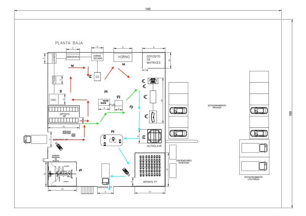 - Las flechas de color rojo indican el recorrido desde la descarga de la materia prima, su traslado al depósito correspondiente, y desde allí hasta las operaciones 1 a 5, incluyendo el primer control de calidad. Luego, continúa hasta la operación 6.