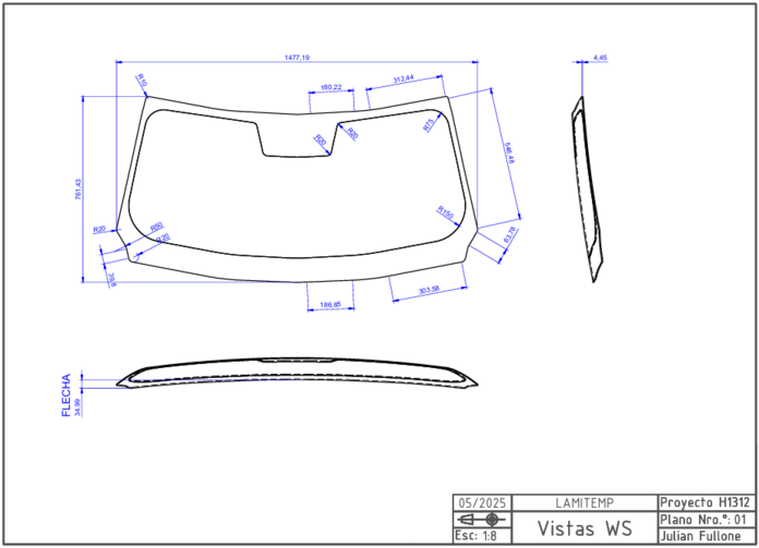 Este producto no se fabrica internamente en la empresa, pero al formar parte del parabrisas final se dibuja y diseña para una correcta representación de este último