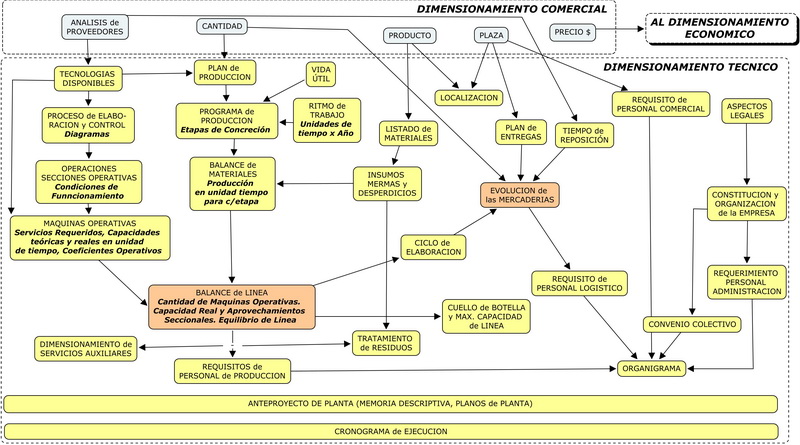 En la etapa de elaboración este dimensionamiento tiene un gran trabajo de ingenieria ya que en necesario definir la localización de la planta, el producto desde el punto de vista técnico, se determinan las tecnologías a utilizar así como también el programa de producción para poder realizar el flujo de insumos y materiales a lo largo de todo el proceso, se hallan las mercaderías necesarias para mantener balanceado dicho flujo, se define el personal necesario y todo esto se dispone en un anteproyecto de planta desde el punto de vista espacial y en un cronograma de ejecución desde el punto de vista temporal.